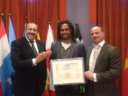 En la foto el presidente de la Organización Mundial por La Paz Carlos Peralta, junto al Secretario General de la agencia de OMPP, Sport and Peace, el veterano del fútbol inglés Walter Palombo, de origen Italo - Suizo, entregan la distinción al mérito al futbolista internacional Christian Karembeu, por su gran trayectoria en diferentes escenarios de Italia, Francia, España en el Real Madrid entre otros, mostrando siempre su espíritu solidario participando cuando se lo solicitara en favor de los match a beneficio de la hambruna y otras actuaciones benéficas.